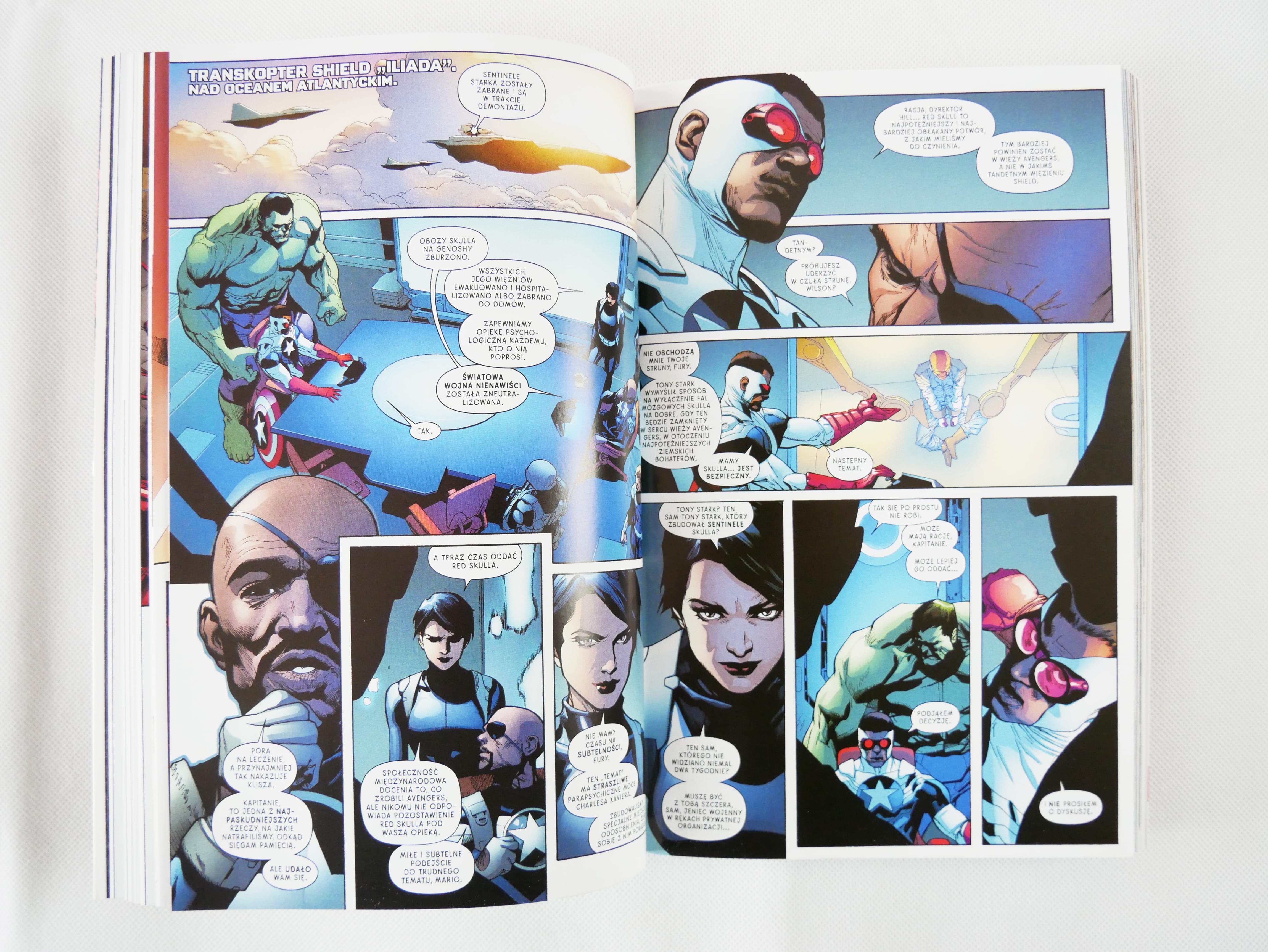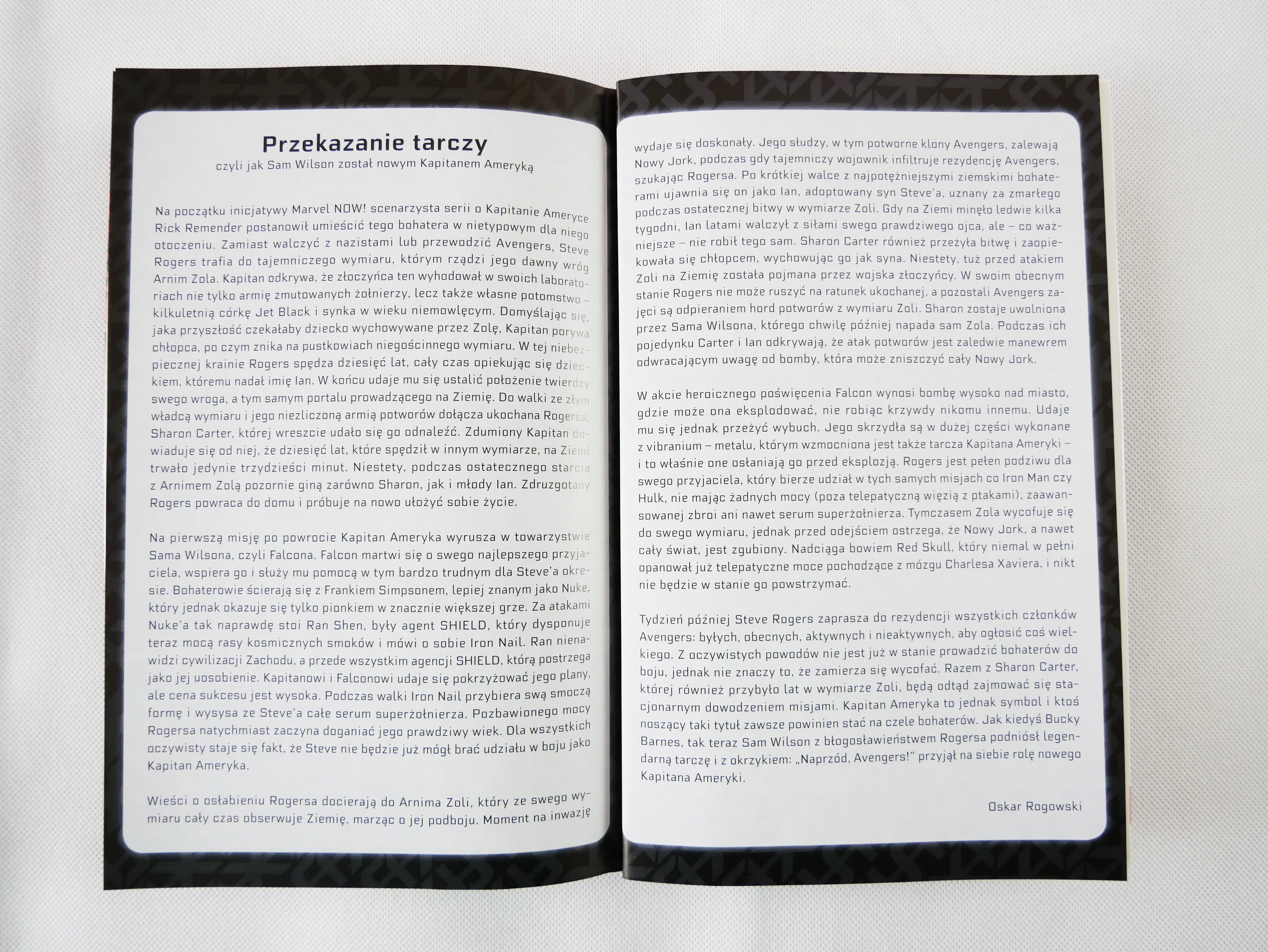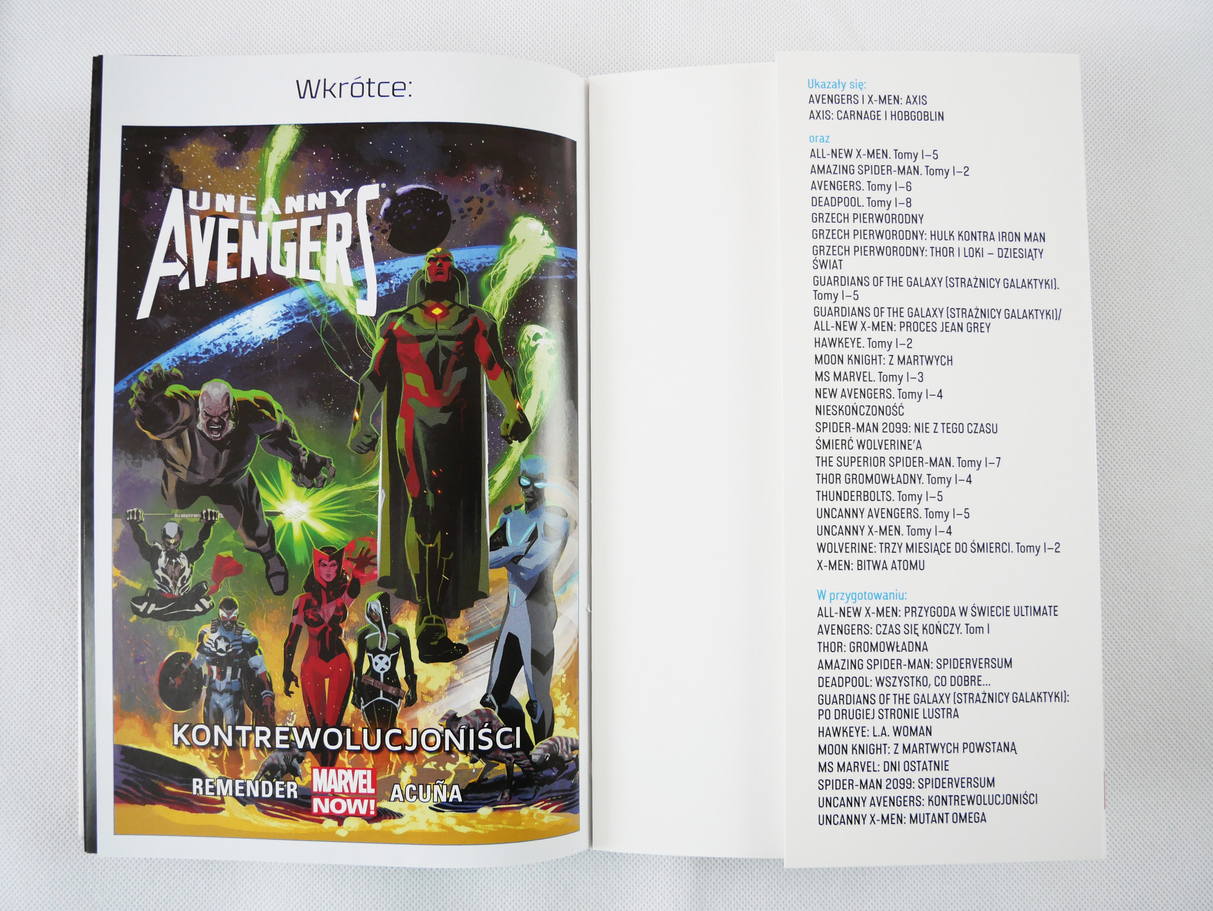 Oprócz standardowych zeszytów w albumie znalazła się galeria okładek i okładek alternatywnych oraz tekst Przekazanie tarczy autorstwa Oskara Rogowskiego. W albumie zapowiedziano kolejny tom serii Uncanny Avengers pod tytułem: Kontrewolucjoniści.