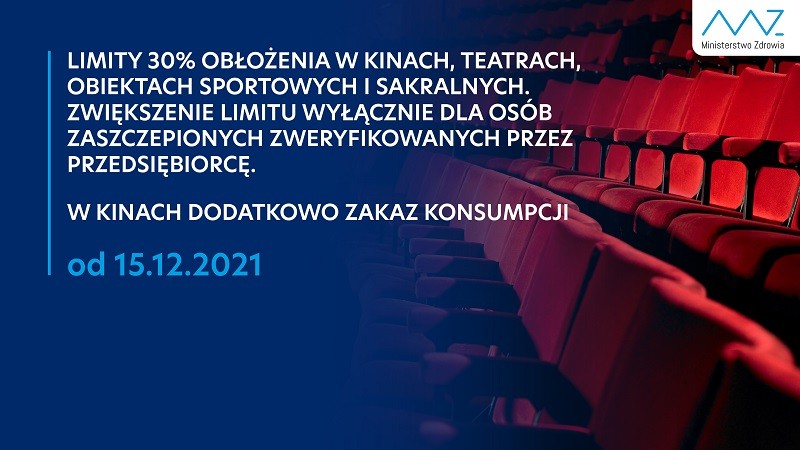 Tym samym minister przekazał, że konieczne jest podjęcie bardziej radykalnych decyzji w celu zmniejszenia liczby zakażeń. Z tego względu zdecydowano o zmniejszeniu limitu obłożenia z 50% do 30% w obiektach sportowych, barach, kościołach i placówkach kultury. To oznacza, że na seanse kina będą mogły sprzedać maksymalnie 30% biletów. Podobnie, jak dotychczas limit nie będzie jednak obejmował osób zaszczepionych. W tym kontekście Adam Niedzielski doprecyzował, że aby wprowadzony limit obłożenia mógł zostać przekroczony, właściciele lokali będą musieli weryfikować certyfikaty osób przebywających w kinach i innych placówkach. W innym wypadku limit nie będzie mógł być przekraczany.