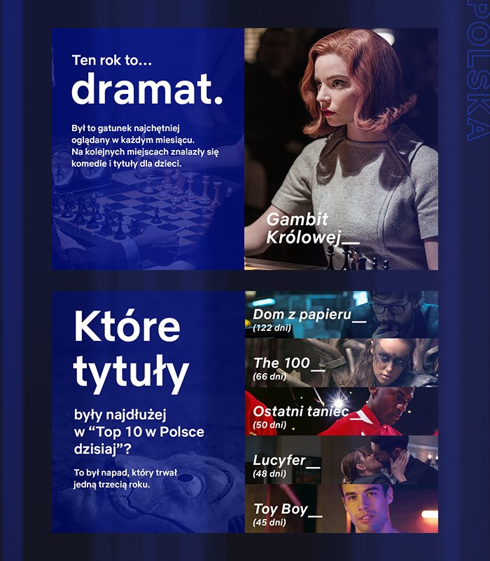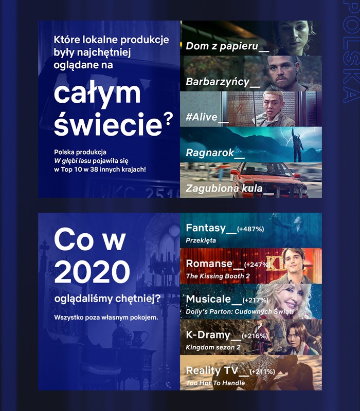 Najczęściej oglądanym gatunkiem 2020 roku był dramat. Produkcje należące do tej kategorii były najczęściej wybierane przez widzów w każdym miesiącu tego roku. Na dwóch kolejnych miejscach znalazły się komedie oraz produkcje przeznaczone dla dzieci. Netflix ujawnił też, które produkcje utrzymywały się najdłużej w codziennych listach Top 10 na polskiej wersji serwisu. Na pierwszym miejscu z wynikiem wynoszącym aż 122 dni uplasował się serial „Dom z papieru”. Kolejne miejsca to „The 100” (66 dni), „Ostatni taniec” (50 dni), „Lucyfer” (48 dni) i „Toy Boy” (45 dni).