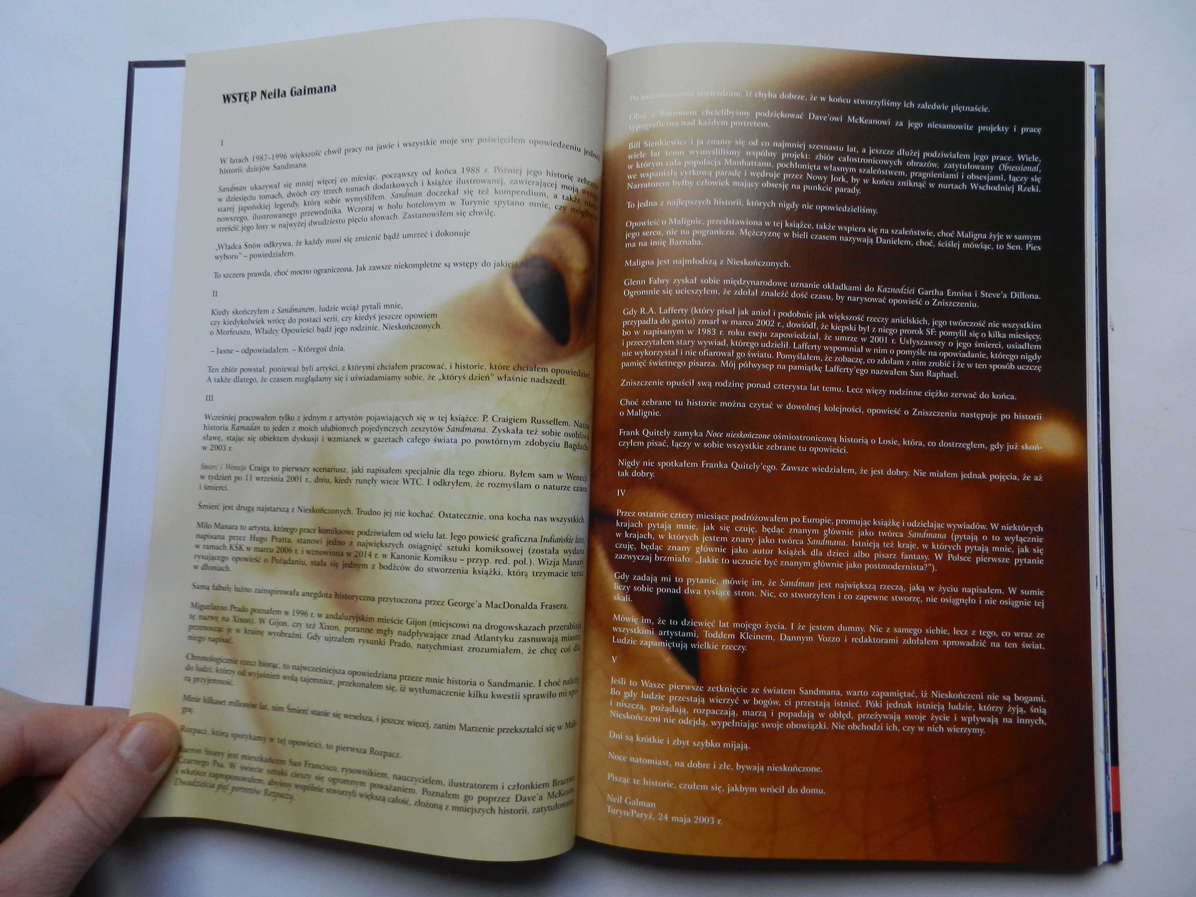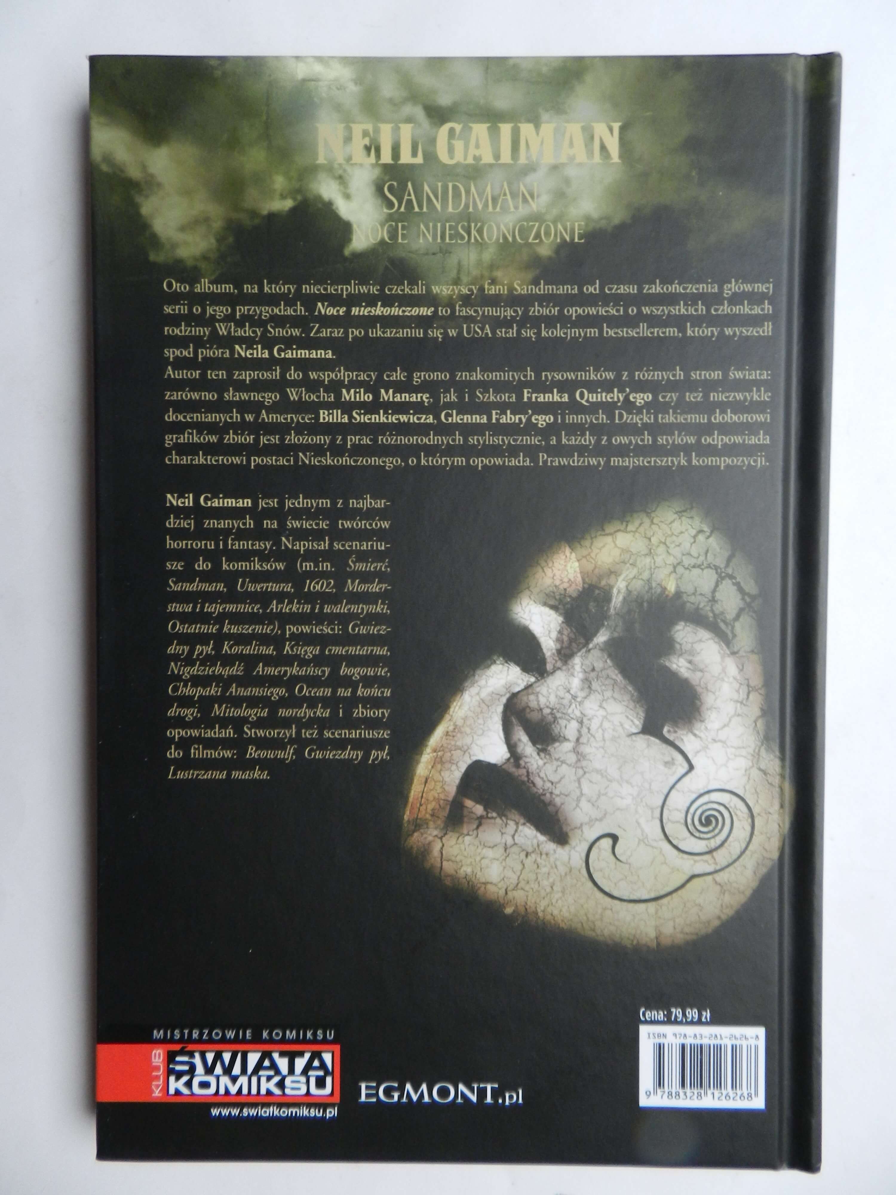 Jeszcze jedno spojrzenie na świat Władcy Snów – Sandmana. Nieprzeciętne scenariusze wspaniałego pisarza Neila Gaimana znakomicie dopełniają rysunki kilku idealnie dobranych grafików, którzy potrafili oddać bogactwo jego wyobraźni. Wśród nich takie sławy europejskie jak Milo Manara czy amerykańskie jak Glenn Fabry. Noce nieskończone to album dodatkowy, a zawarte w nim historie rozgrywają się już po zakończeniu głównego cyklu. Nie jest jednak typowym sequelem, a zdaniem czytelników i krytyków okazał się nawet lepszy od niektórych tomów serii podstawowej.